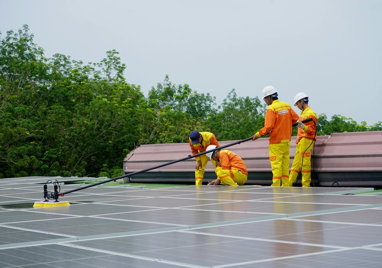 Do czyszczenia paneli używamy wysięgników teleskopowych z miękką wodą demineralizowaną. Regularne mycie zwiększa wydajność instalacji i zabezpiecza przed uszkodzeniami (np. przez ptasie odchody czy pyły).